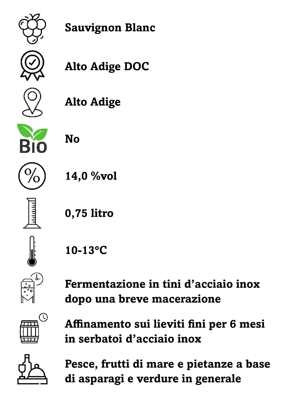 Il vitigno bianco Sauvignon viene coltivato in Alto Adige da oltre un secolo. Il profumo intenso di ortica e sambuco e la freschezza e vivacità in bocca sono tipici per questo vino. Le colline di Girlan di 400-500 m di altezza e la vicinanza delle Alpi orientali attribuiscono al Sauvignon il suo profumo intenso e caratteristico. Le uve crescono su terreno ghiacciale morenico e vengono vendemmiate alla maturazione ottimale.