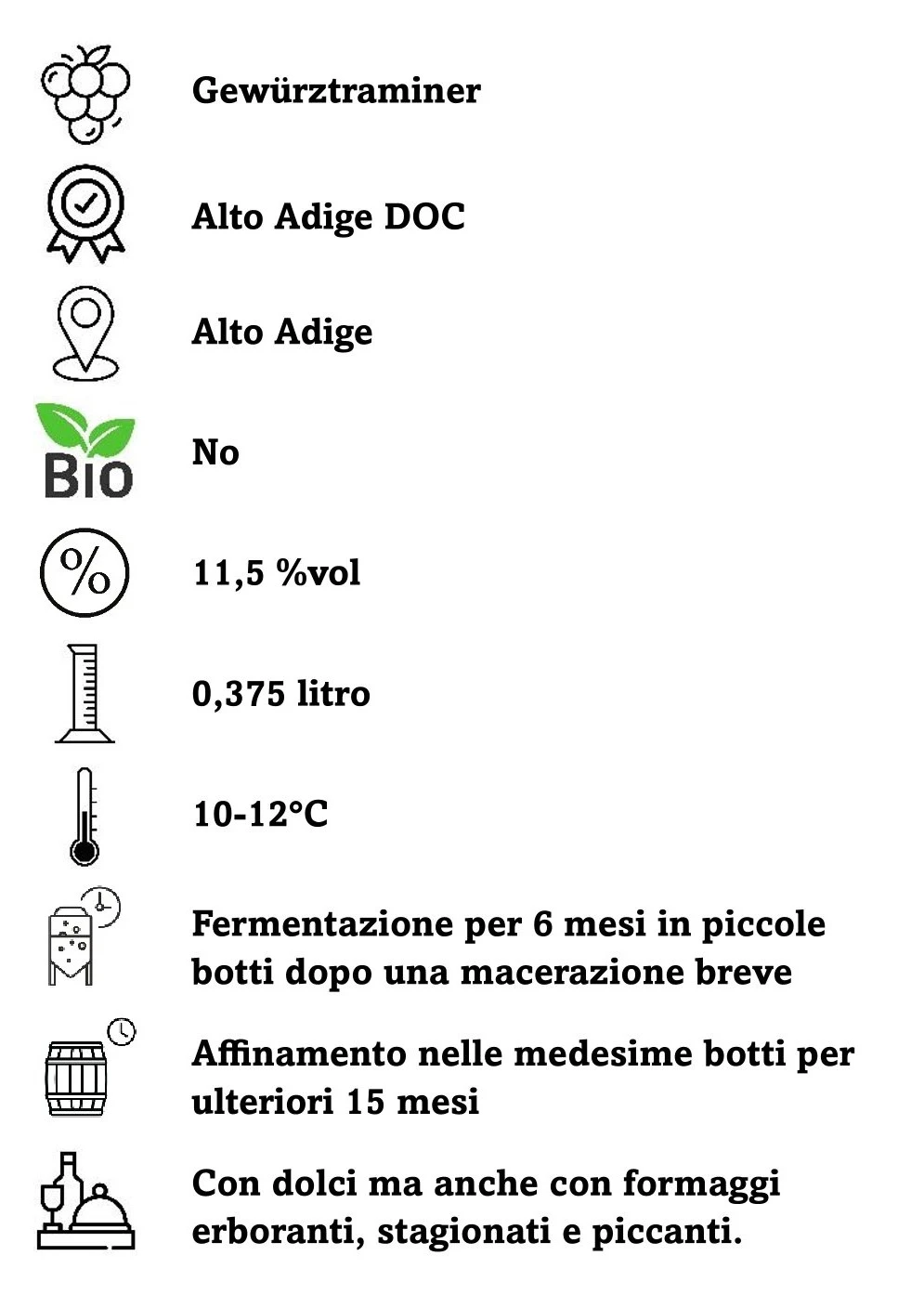 Un vino aromi di frutta secca, albicocche mature e cotogno compongono la sinfonia dei profumi, completati da un pizzico frescio d'agrumi. In bocca il vino è morbido, pieno con una dolcezza accentuata e persistente nel finale.