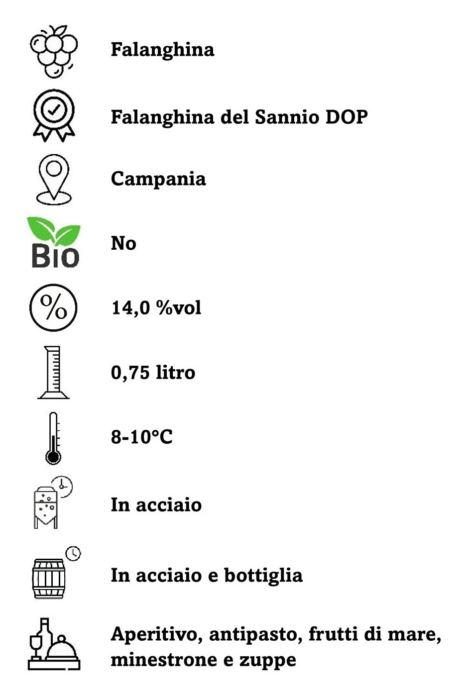 Dal colore giallo paglierino più o meno intenso, dai profumi complessi con frutta esotica matura; floreale con note spiccate di fiori di glicine e di macchia mediterranea. Dal sapore ricco di personalità, armonico e persistente; in bocca equilibrato con sensazioni finali fresche e sapide. Ottimo equilibro, acidità e morbidezza.