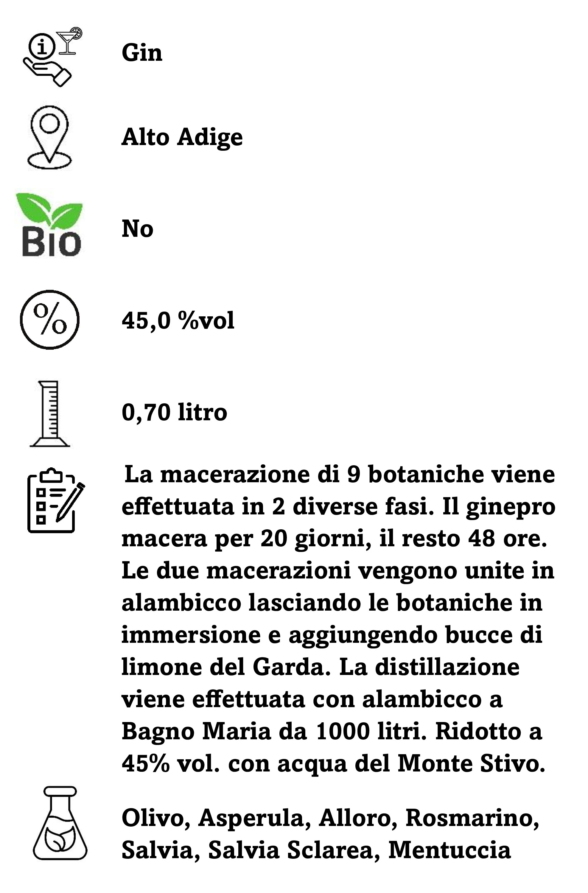 Al naso si percepisce il ginepro, con note finali leggermente agrumate, buona persistenza e intensità. Al palato è complesso, secco, deciso, erbaceo, lascia il palato asciutto con piacevoli note di ginepro, ottima persistenza.