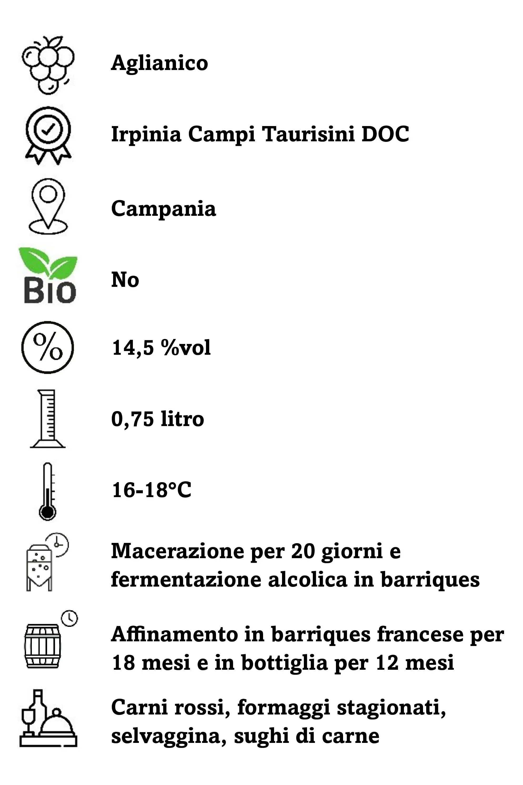 Il vino al palato ha un sapore denso, concentrato, pieno, al naso presenta sentori di frutti rossi maturi, spezie e ciliegia maiatica di taurasi la barrique da supporto all’aroma senza però coprirlo.