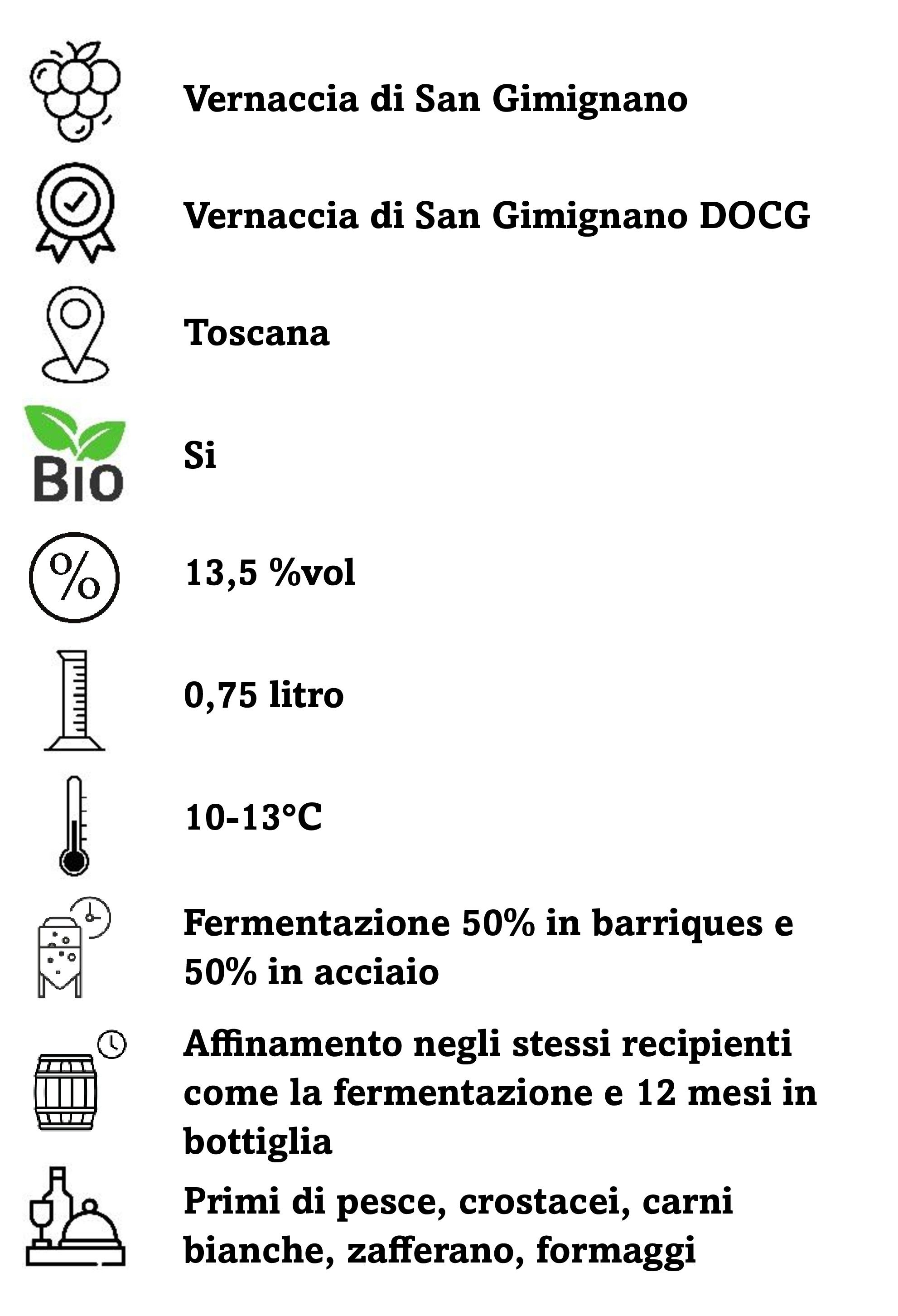 Uno dei pochi cru di San Gimignano, nasce dalla vigna a noi più cara e prende il nome dalla località in cui Panizzi è nota; dalle viti di questo vigneto hanno origine tutti i vigneti di Vernaccia di San Gimignano impiatati negli anni dall'azienda.