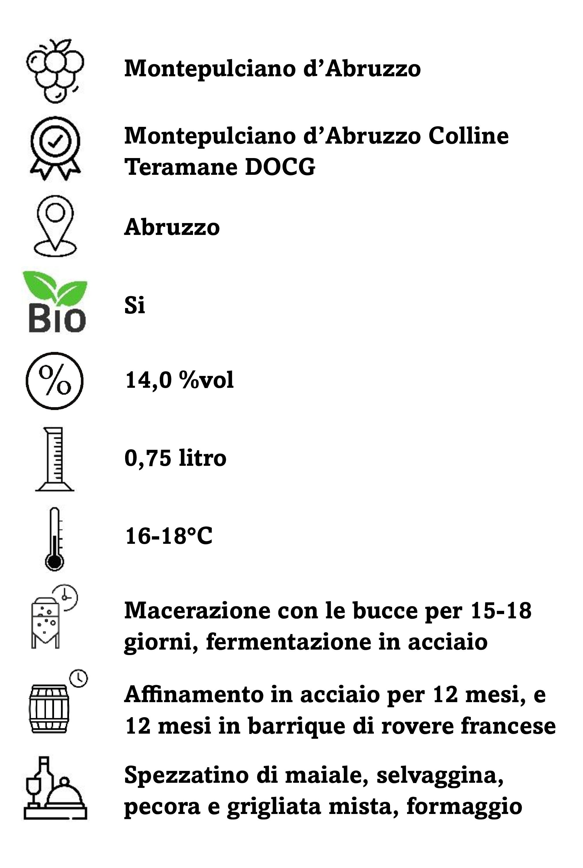 Vino con colore rubino carico, consistente, concentrazione ai limiti della trasparenza; lento nella scorrevolezza elargisce lacrime ed archi sulle pareti del calice, testimoni della grande struttura che lo compone. Il profumo è con lunga persistenza olfattiva, profumi terziari fin dal debutto uniti a sentori di confettura di frutta rossa, spezie dolci, noce moscata, con chiusure pepate, iodate ed affumicate. Un sapore secco, caldo, morbido, maturo, con tannini vigorosi integrati nella materia e grande mineralità, elegante e con lunga possibilità di invecchiamento.