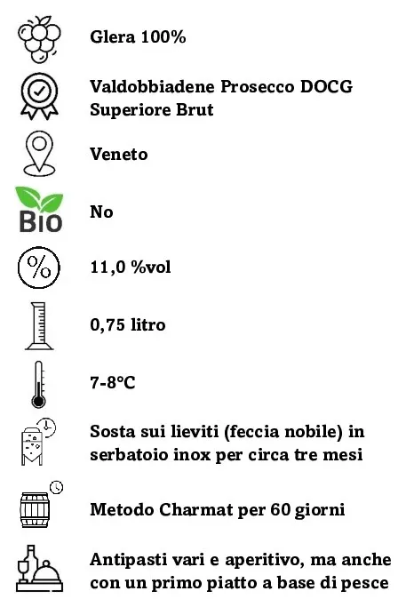 Il suo colore giallo paglierino tenue nasconde un’intensità e una freschezza notevoli e un perlage persistente. Ha un profumo fruttato dal quale s’esalta l’aroma della mela “golden”. Ottimo aperitivo è abbinato agli antipasti in genere. Accompagna degnamente tutto il pasto. Ideale con la frutta secca.