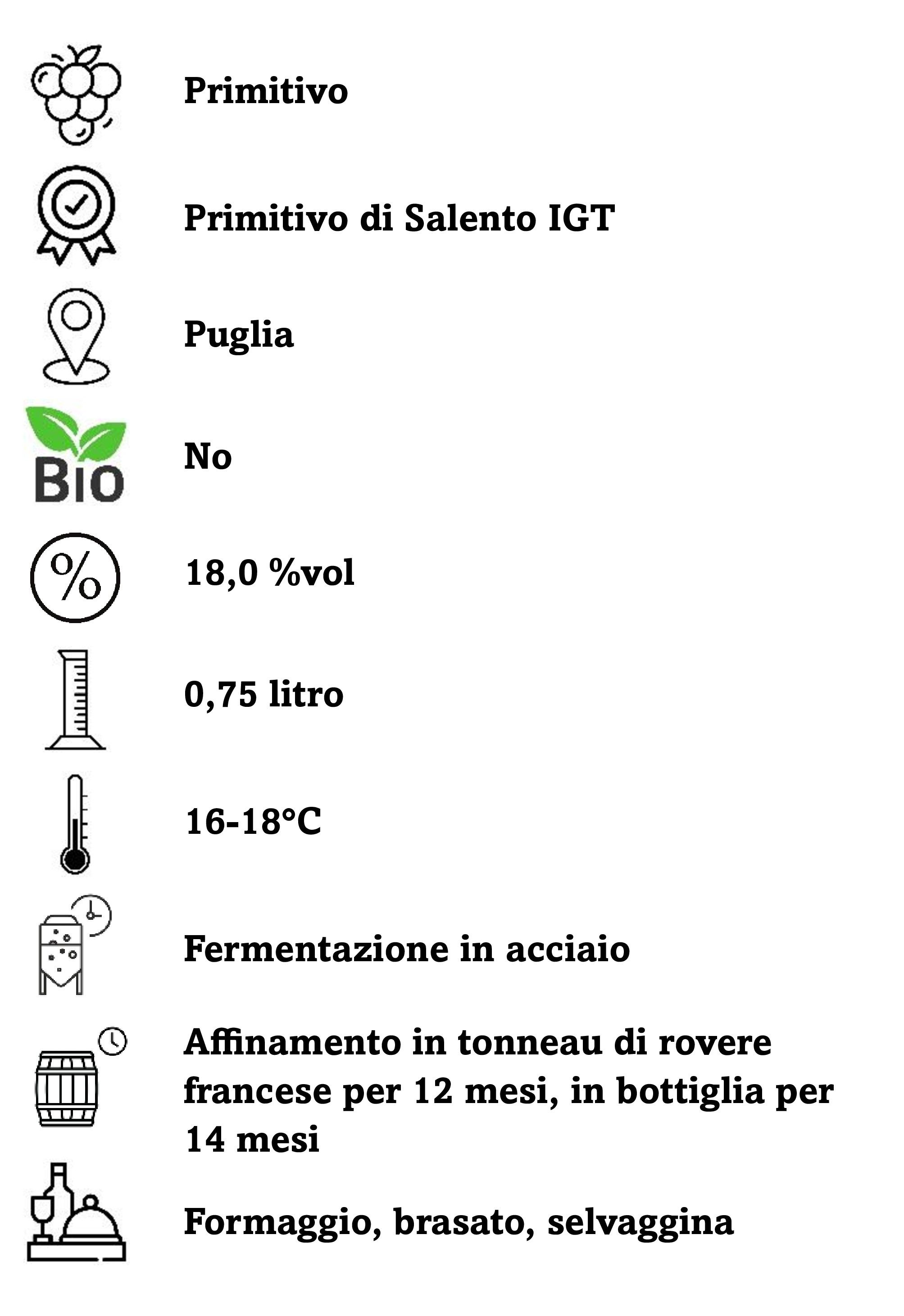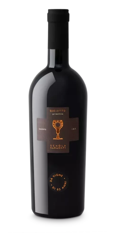 Vellutato e avvolgente. Una incera e minuziosa espressione del Primitivo. Diciotto e un vino prodotto a partire da vitigni di 80 anni allevati con il tradizionale ed antico metodo dell'alberello pugliese. 80 anni di storia che sgorgano nella linfa delle piante più vecchie dei vigneti Schola Sarmenti. Un vino esclusivo, prodotto in tiratura limitata.