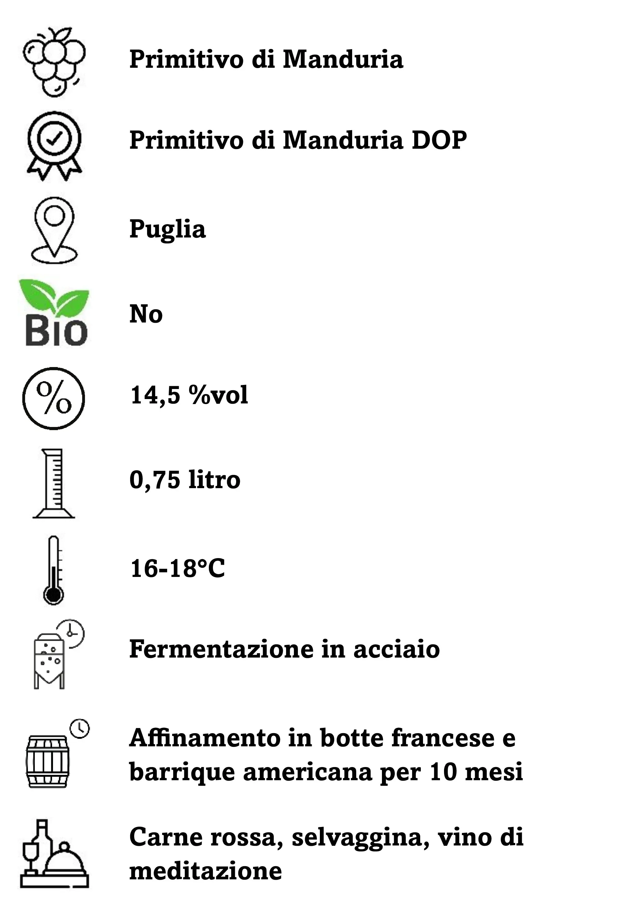 Bouquet con frutta rossa matura, chiodi di garofano, amarena sotto spirito, con note di mandorle tostate e caffè. In bocca, un tannino maturo e vellutato ed una composita intensa.