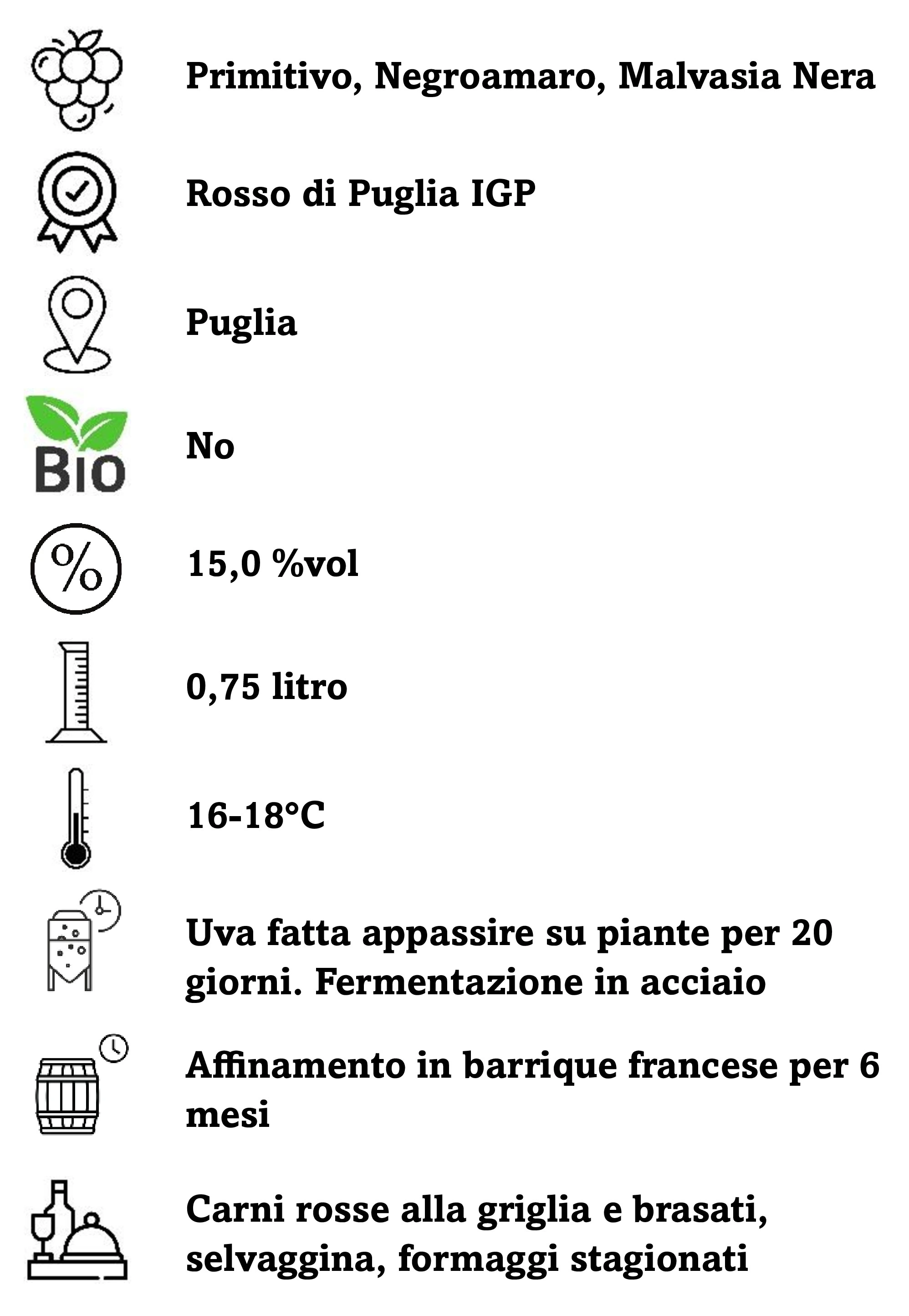 Al naso frutta rossa matura, confettura di amarena e note di vaniglia e cioccolato. Al palato è strutturato e dominato da tannini vellutati. Un vino morbido e avvolgente.
