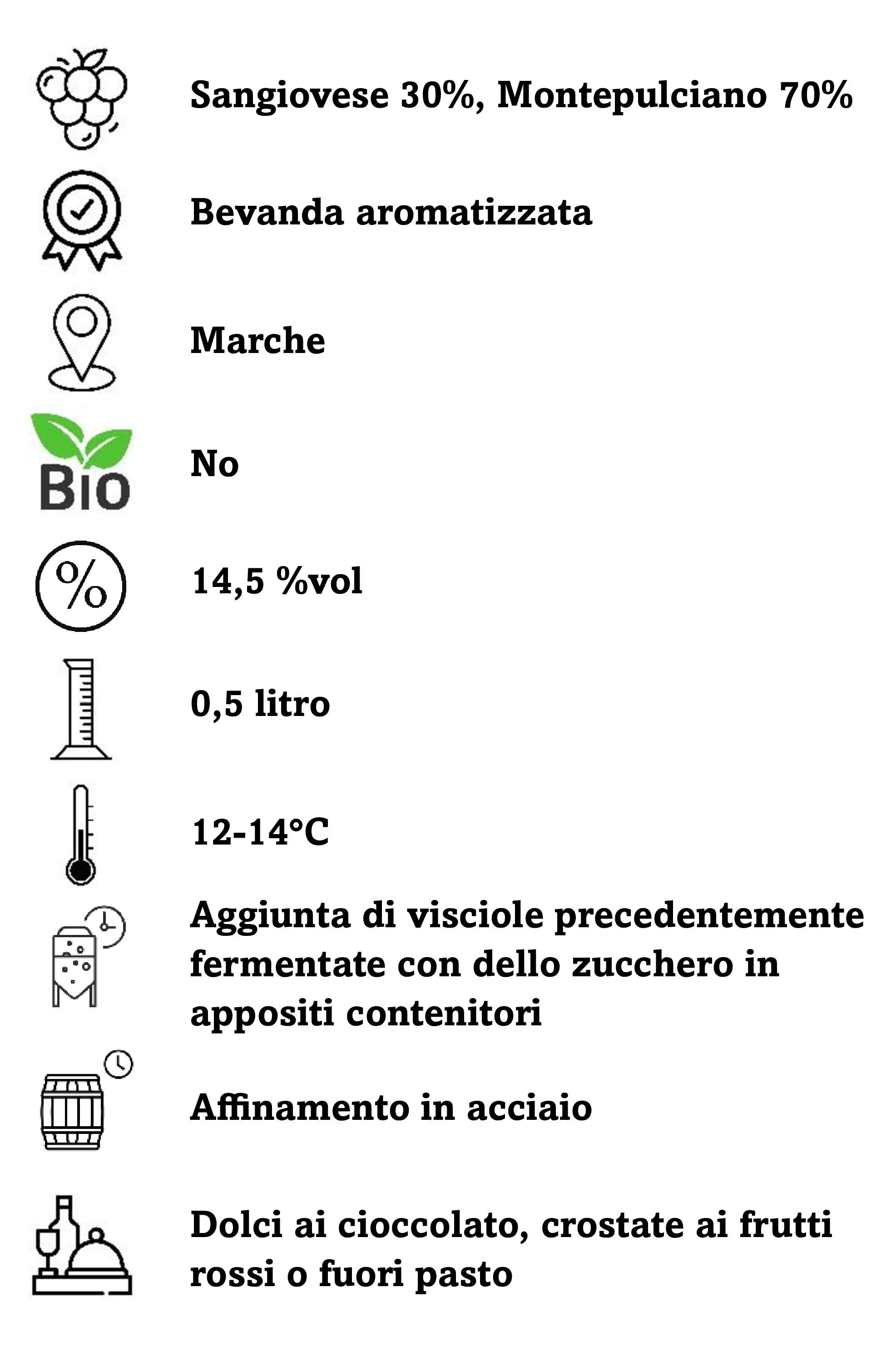 Questo vino si ricava da una lunga fermentazione delle uve di Montepulciano, Sangiovese con aggiunta successiva di visciole. La visciola è una ciliegia piccola, sferica, di colore scuro e di sapore acidulo. Questi frutti si mettono in recipienti di vetro con zucchero che vengono esposti al sole nei caldi mesi di fine Giugno-Luglio; dalla loro fermentazione si origina uno sciroppo. Le visciole, da sempre presenti nella nostra tradizione, venivano utilizzate, oltre che per fare il vino, anche come bevanda dissente. Il vino è di colore rosso rubino intenso, vinoso e pieno. Amabile-dolce con retrogusto leggermente amarognolo, profumato, si abbina bene a qualsiasi dolce.