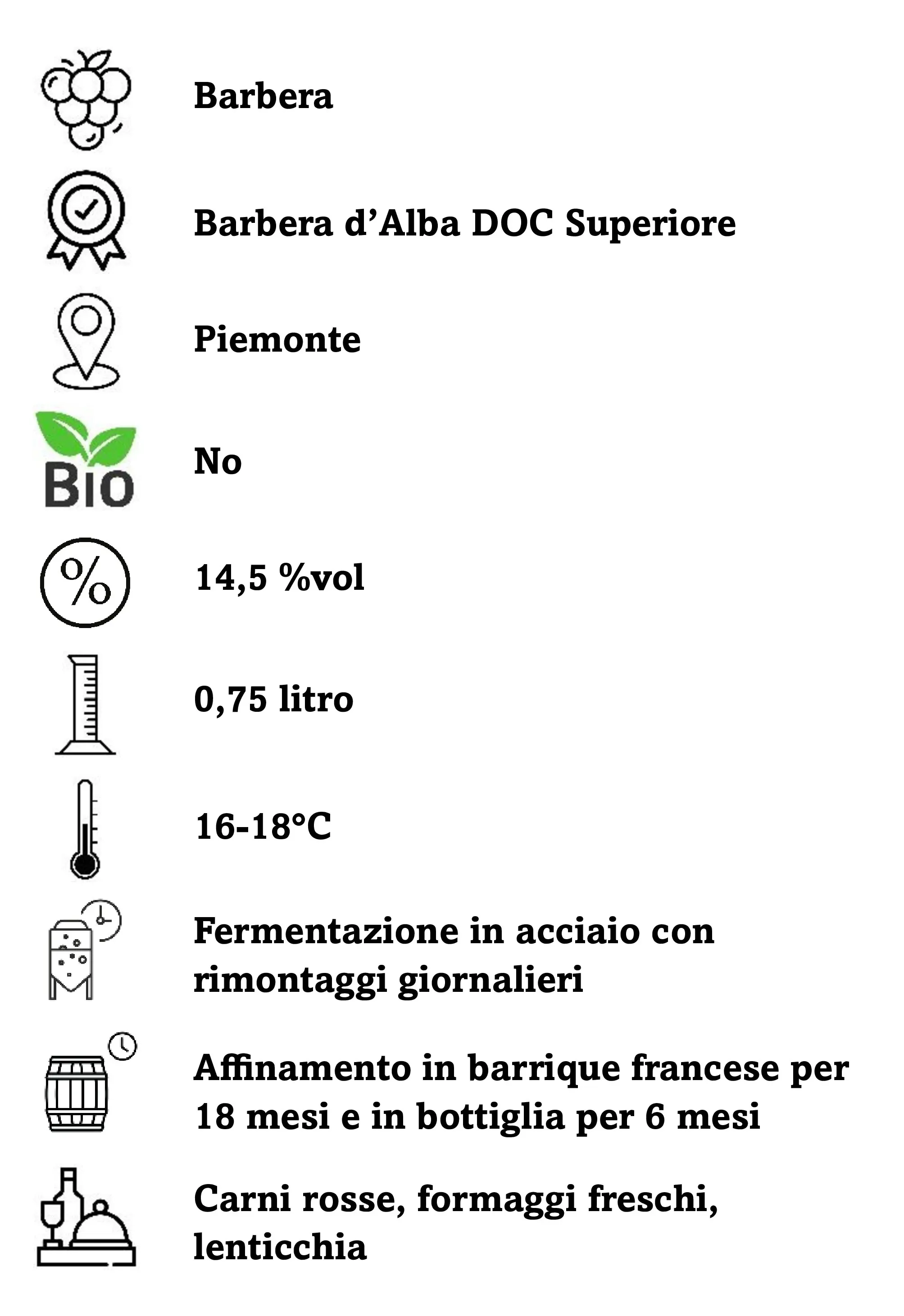 Colore rosso granato intenso vivo con lievi riflessi violetti. Olfatto netto ampio con note di rosa, mora, cioccolato e vaniglia. Gusto pieno armonico caldo sapido con retrogusto gradevolmente persistente. Un vino longevità.