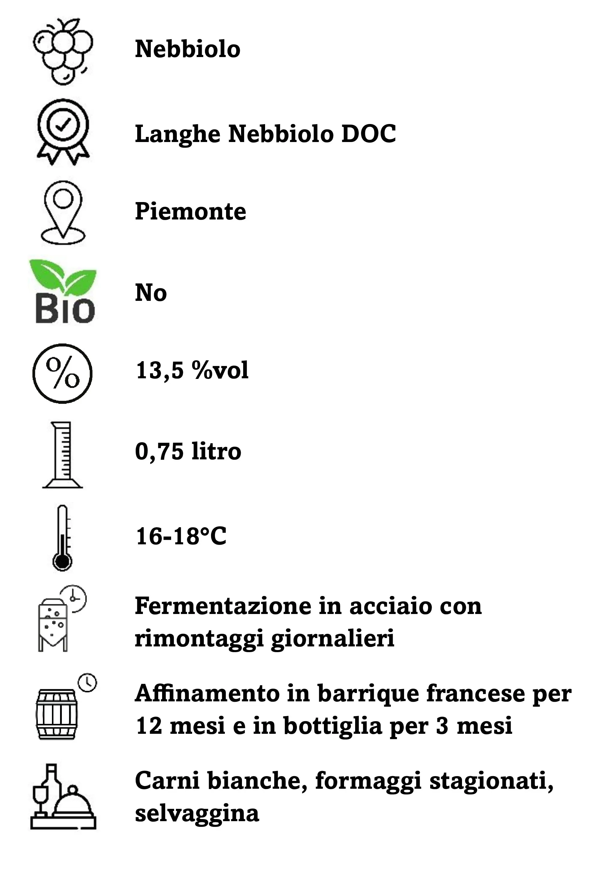 Colore rosso rubino di media intensità vivo con lievi riflessi violacei. Olfatto netto ampio con note floreali intense di viola e fruttate di lampone, leggera spezia. Gusto armonico di medio corpo leggermente asciutto ma con finale persistente e gradevole. È un vino di grande bevibilità e di media longevità.
