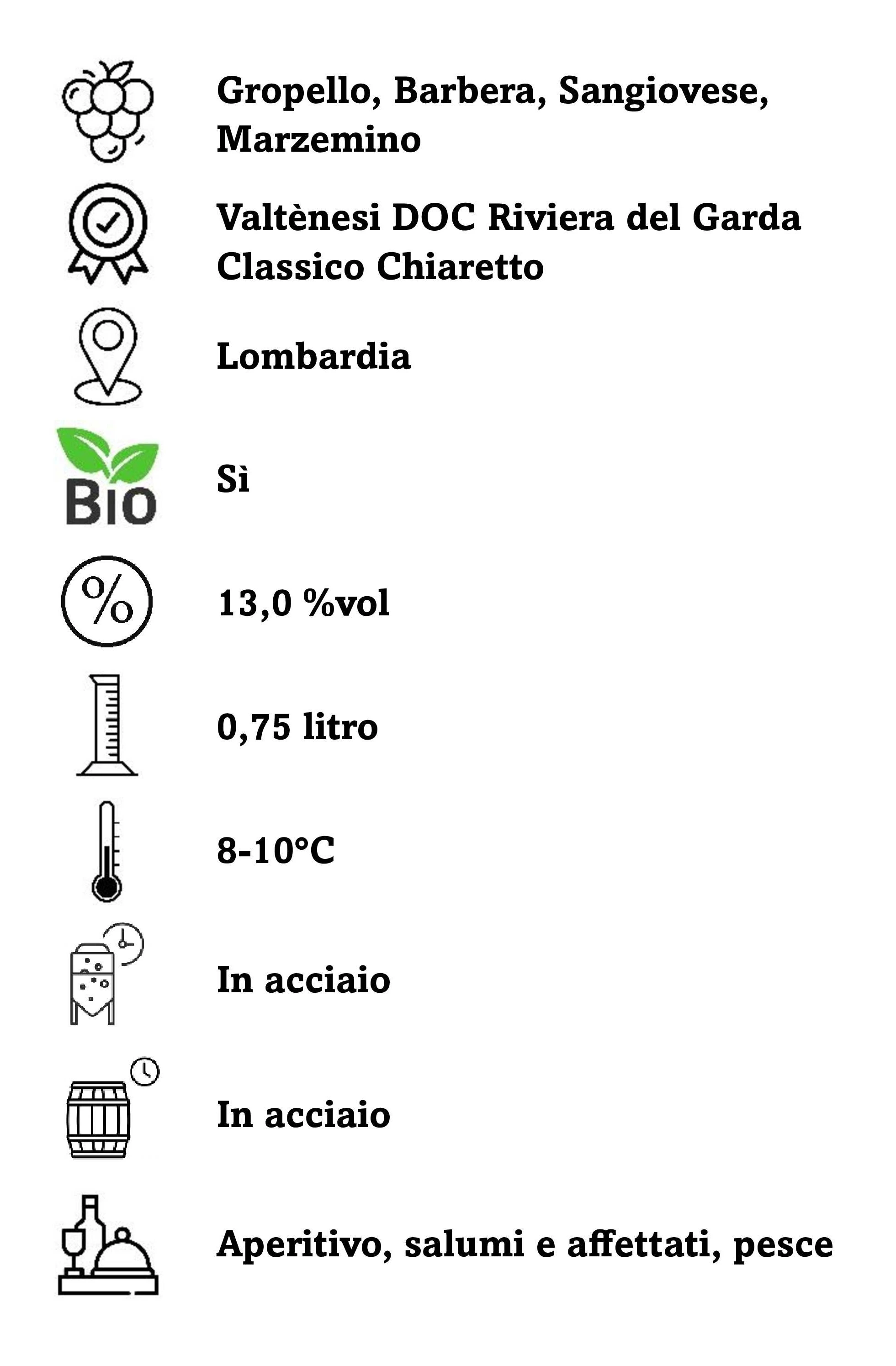 Il più tipico dei vini della sponda occidentale del Lago di Garda, per la DOC di più recente costituzione il "Valtènesi", nata per codificare una tecnica e uno stile tramandato di vendemmia in vendemmia da oltre cento anni. Prodotto solo con uve rosse, questo vino è la migliore espressione del nostro fortunato territorio, bagnato dal lago più grande d'Italia.