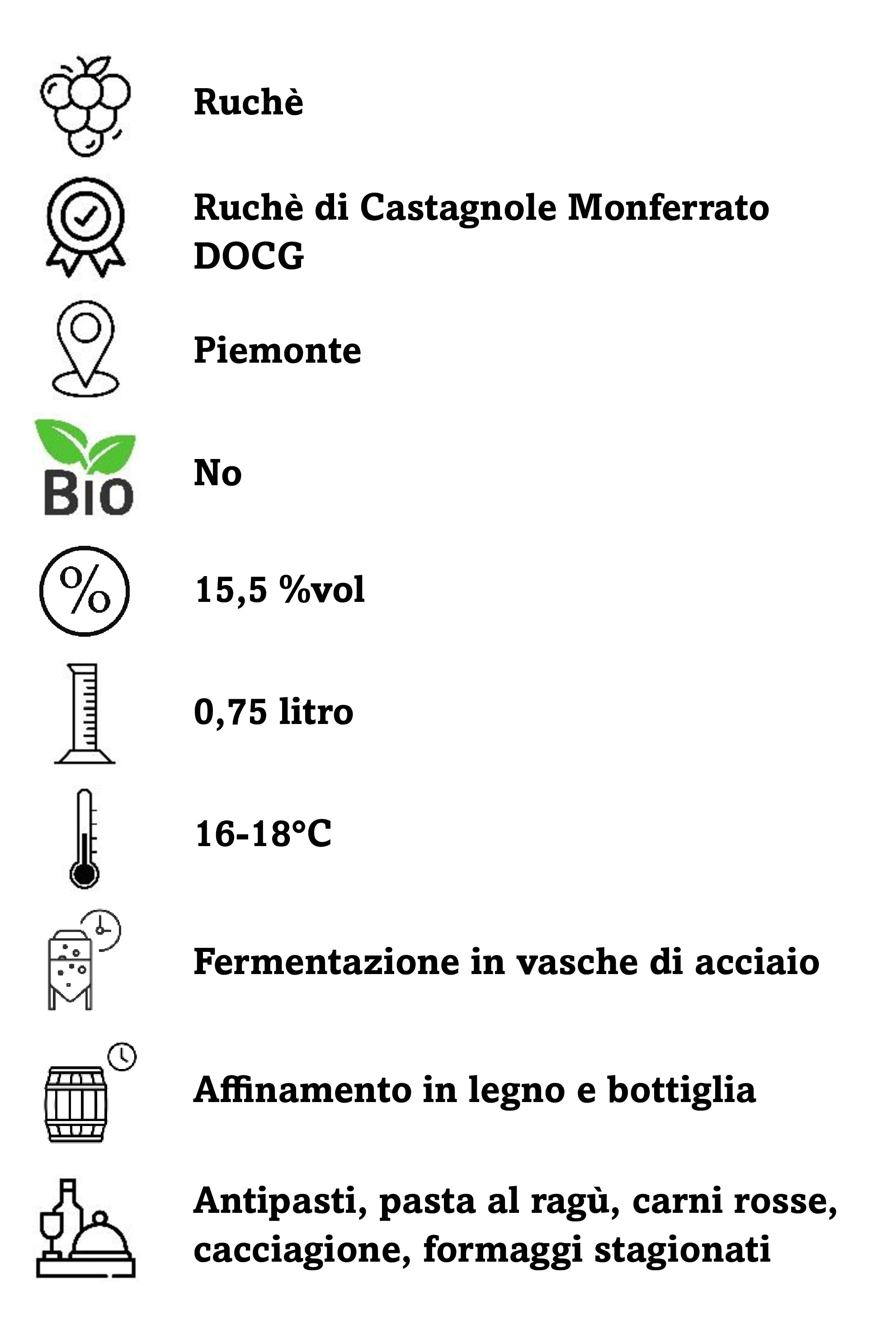 Vino fermo dal colore rosso rubino. Al naso il profumo è ampio e persistente, con evidenti note di rosa e frutta matura rossa. Al palato è molto elegante, avvolgente con tannini morbidi e vellutati di grande intensità e persistenza aromatica.
