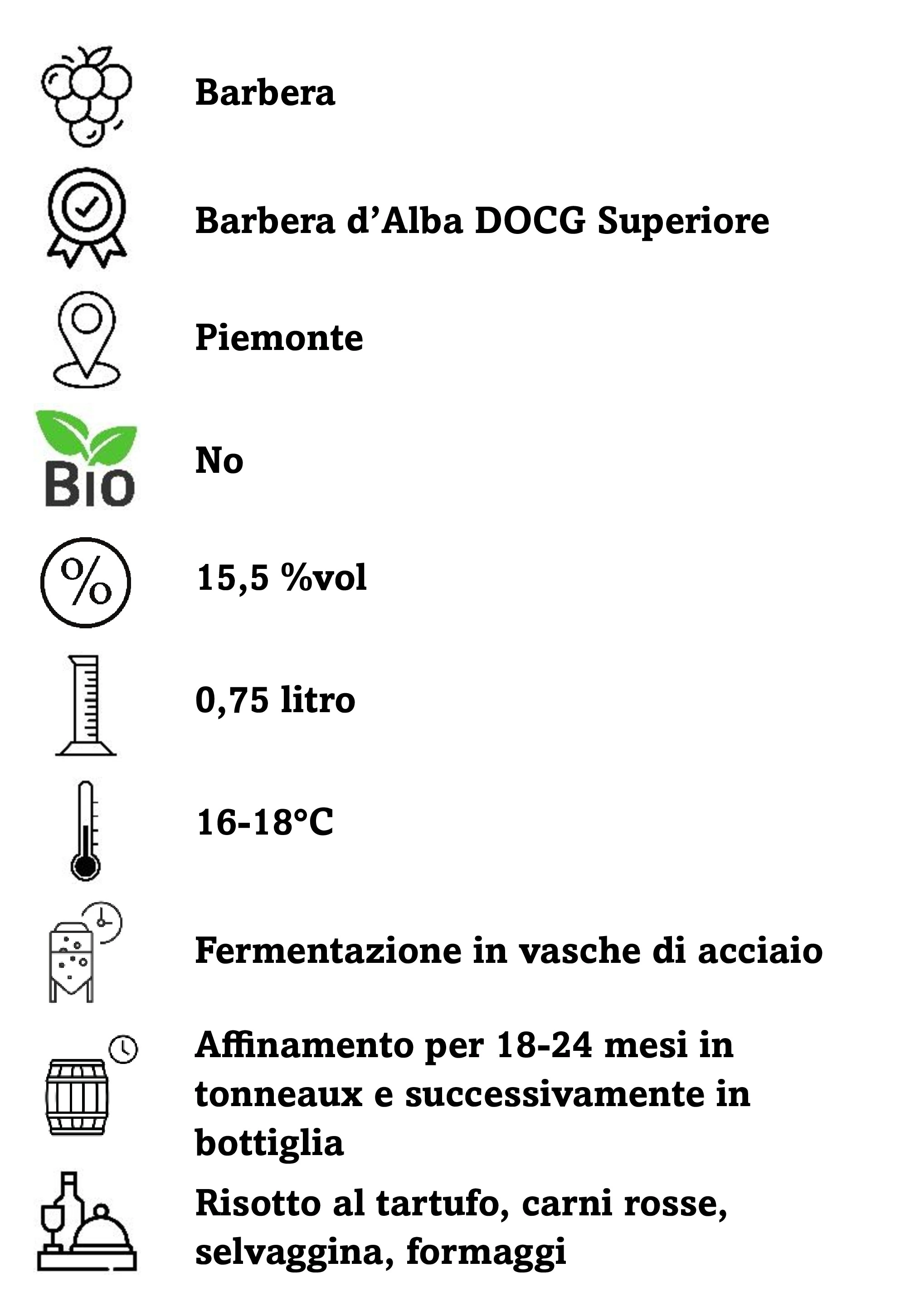 Di colore rubino intenso. Al naso è diretto, con note di ciliegia, spezie e sensazioni di vaniglia. Al palato è elegante, di particolare godibilità e persistenza gustativa. Chiude con una piacevole acidità tipica della Barbera.